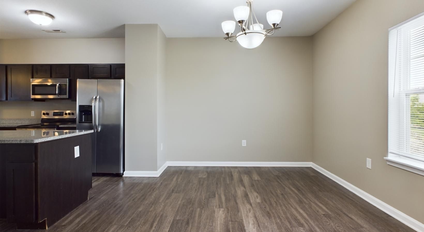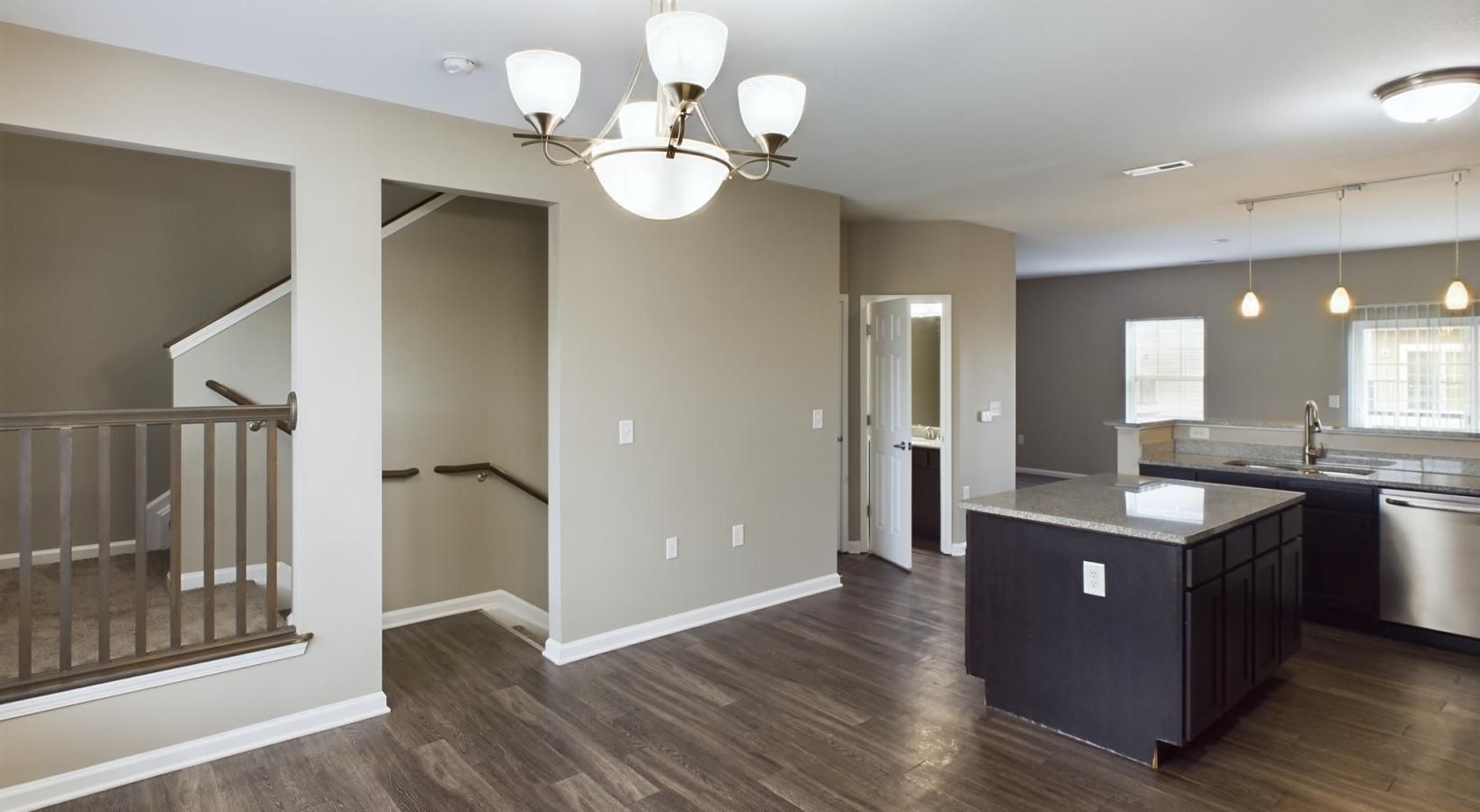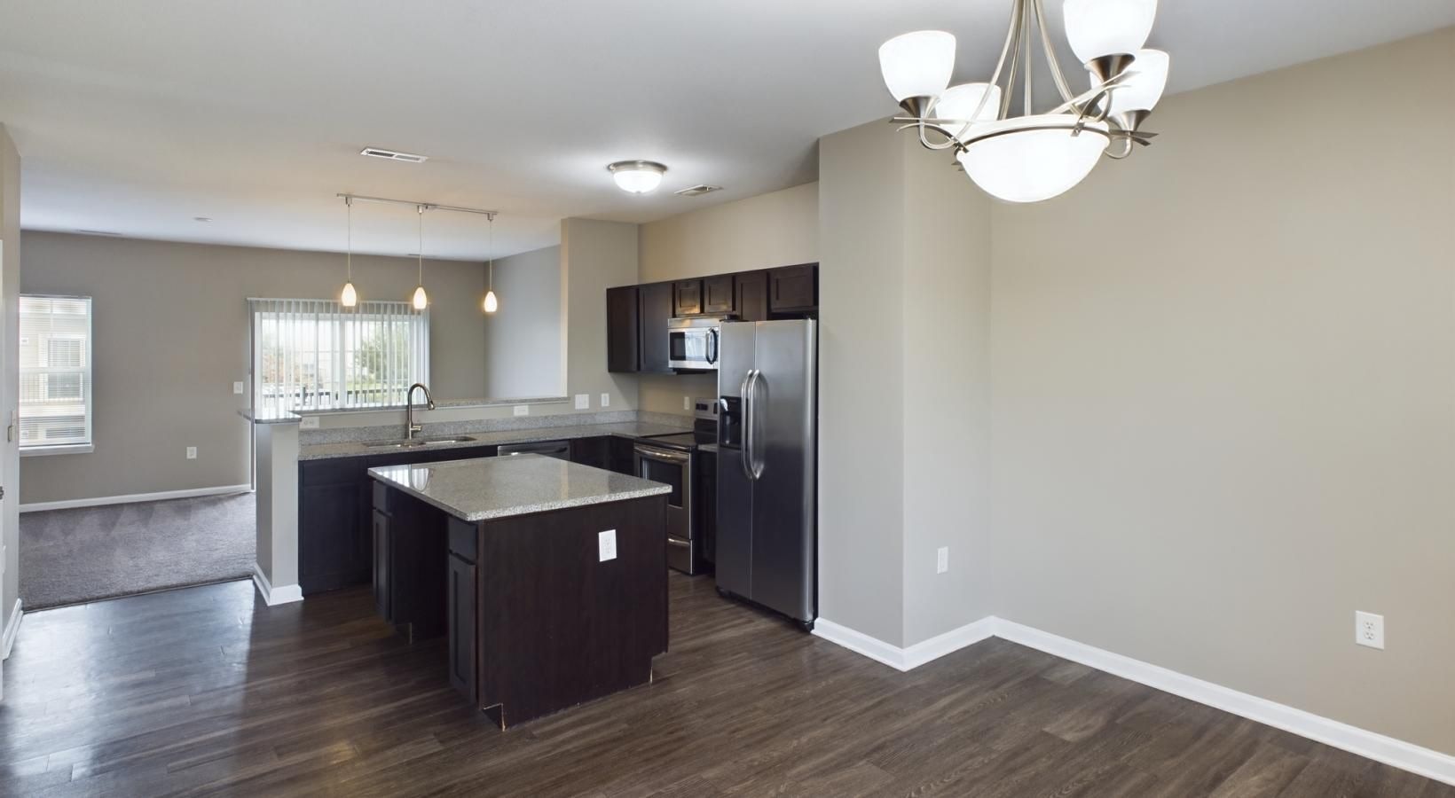 • a large kitchen with a chandelier and a wood floor