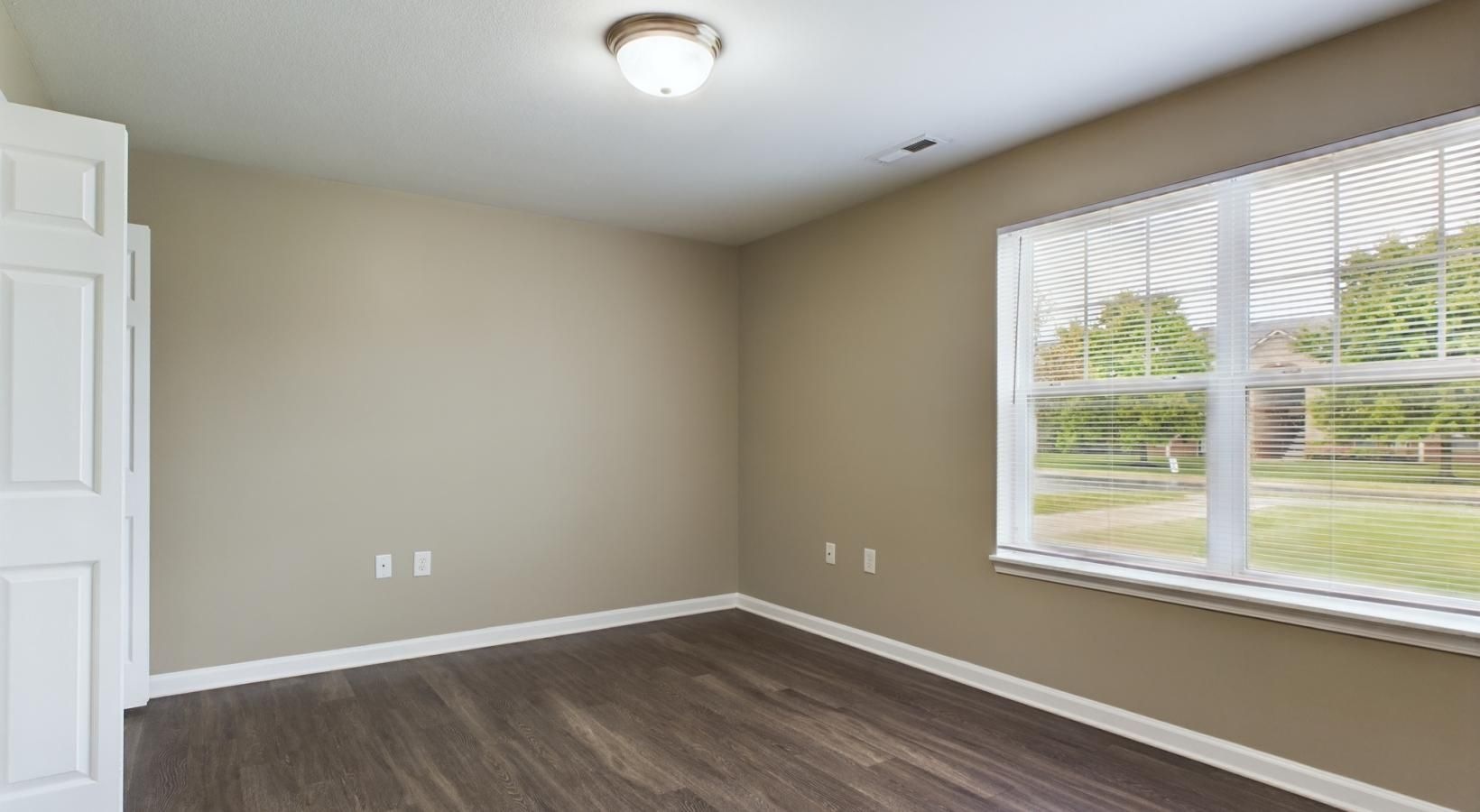 • a room with a wood floor and a window with a light