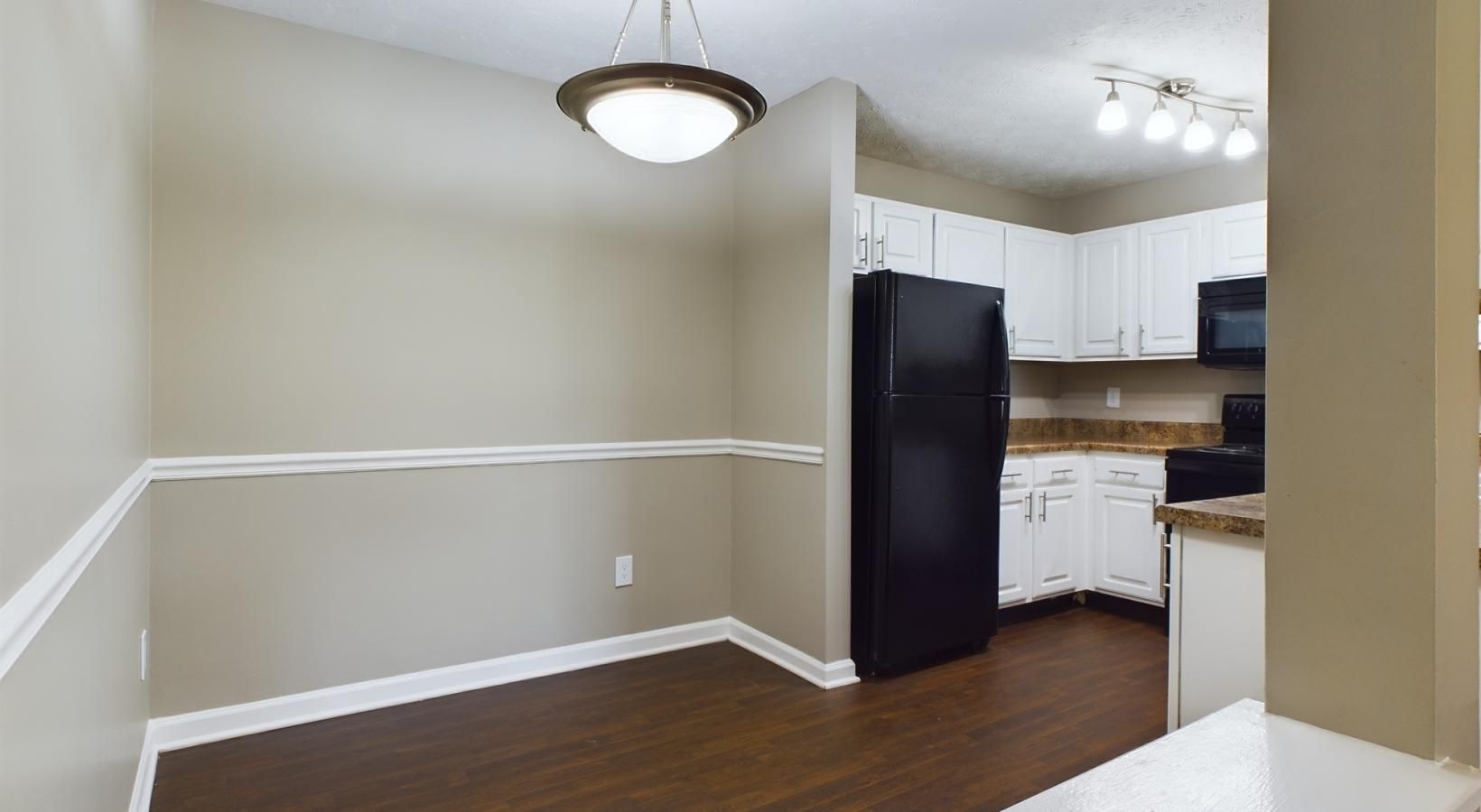 • a kitchen with a black refrigerator