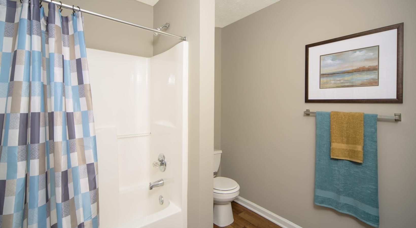 • a bathroom with a shower curtain