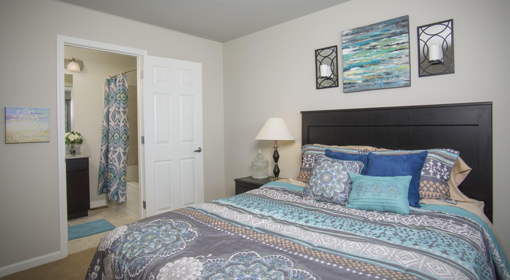 • a bedroom with a bed and a lamp