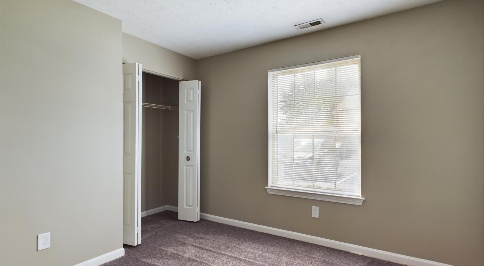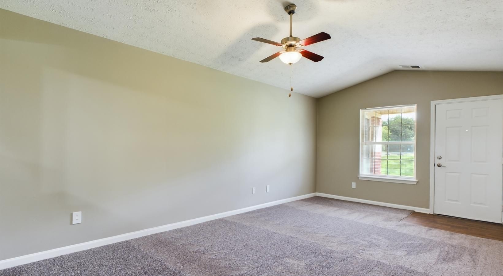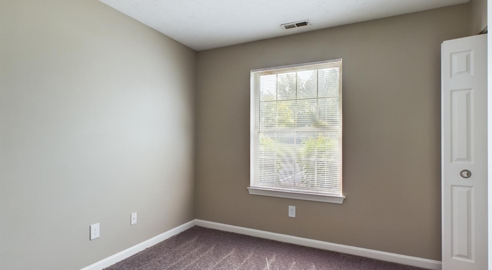 • a room with a carpet and a window
